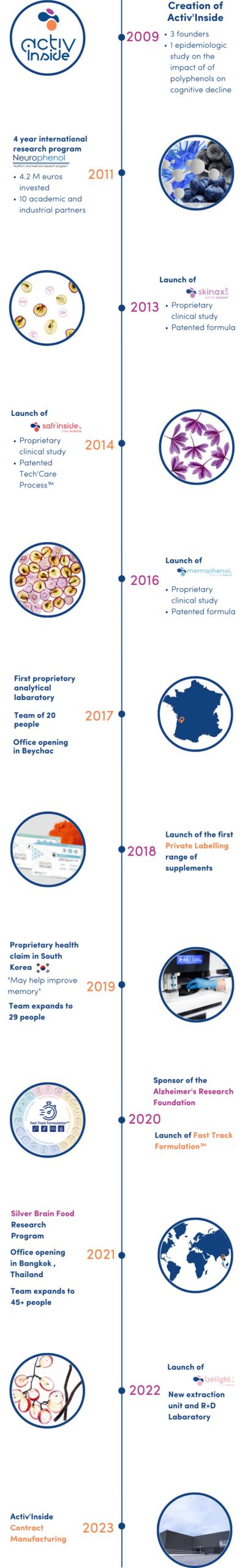 Our installation in our Beychac offices marks a point where after our growth as a company kicked into high gear. The following years were punctuated by the launch of our first Private Labelling range of supplements and the consequential growth of our commercial team, attaining a proprietary health claim for Memophenol™ in South Korea, and our sponsorship of the Alzheimer’s Research Foundation. The launch in 2020 of Activ’Inside Fast Track Formulation™, an innovative formulation tool, represented the result of several years of development and showcased our ever-growing formulation and regulatory expertise.